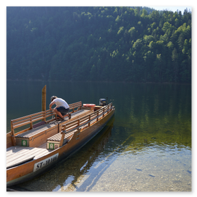 Am Toplitzsee erfolgt die Weiterfahrt mit einem traditionellen Holzboot („Plette“) bis zum gegenüberliegenden Ufer.