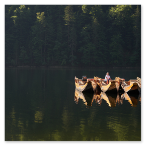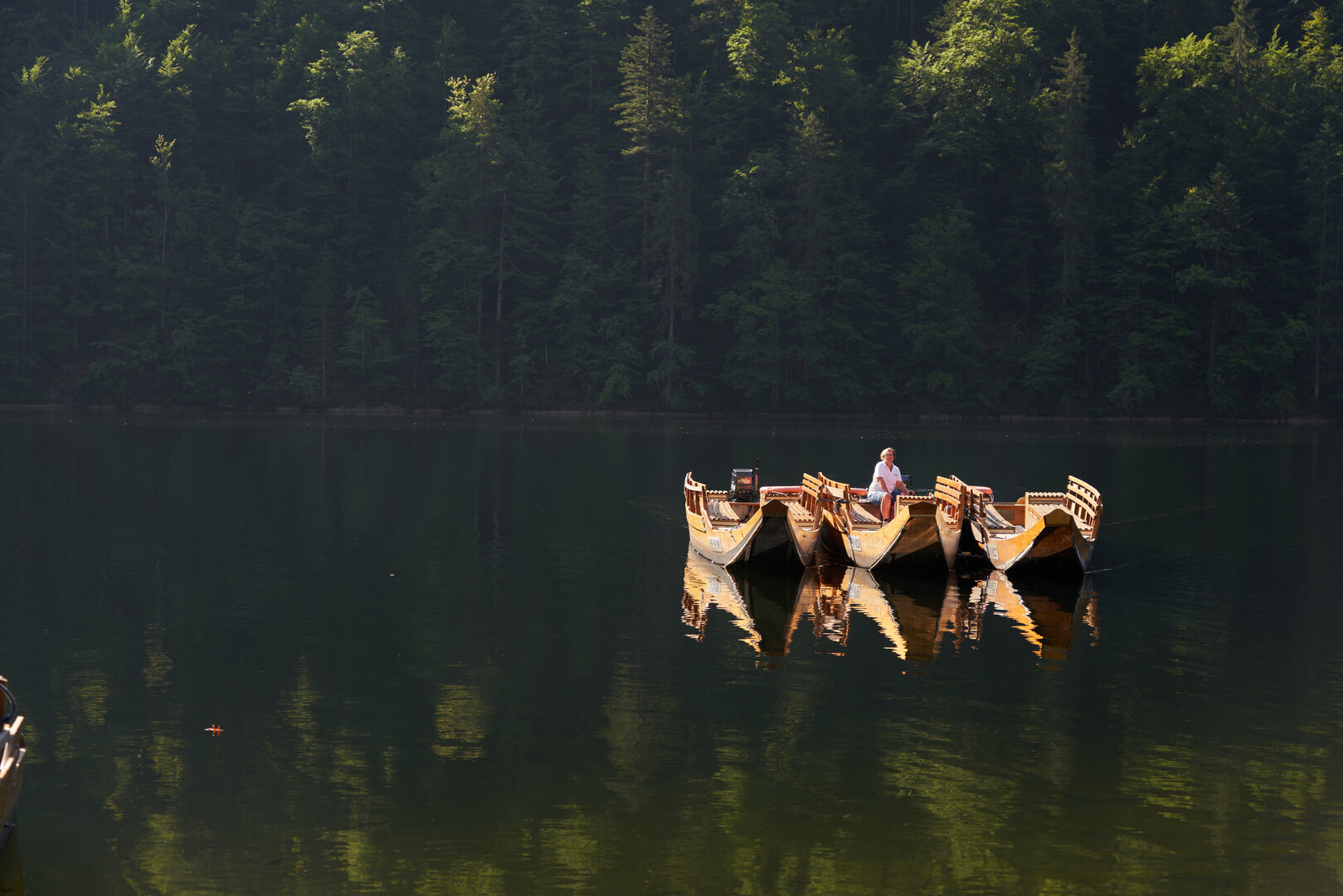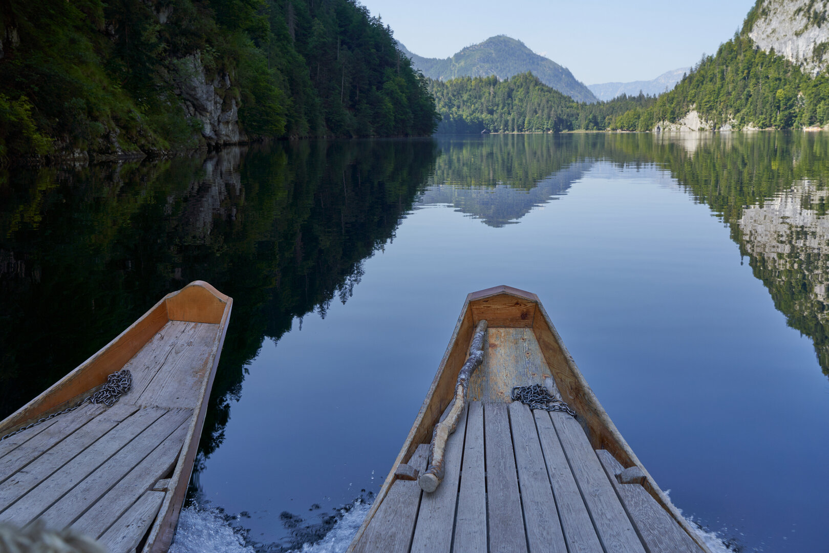 Zuerst ein kleines Motorboot über den Grundlsee. Am Toplitzsee erfolgt die Weiterfahrt mit traditionellen Holzbooten („Pletten“) – ruhig, flach und offen.