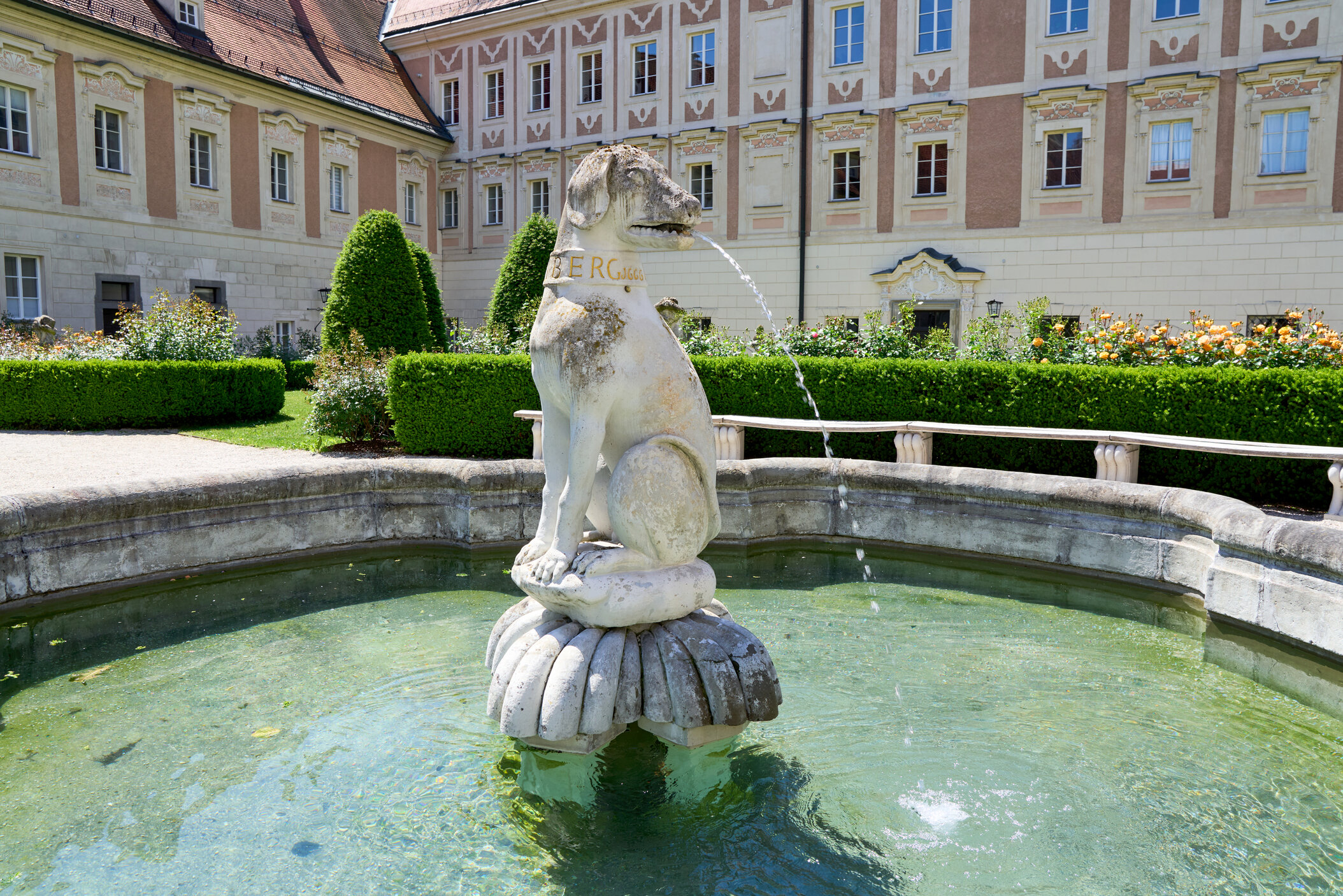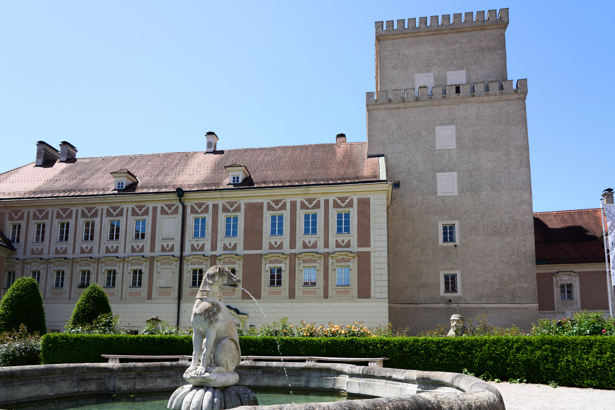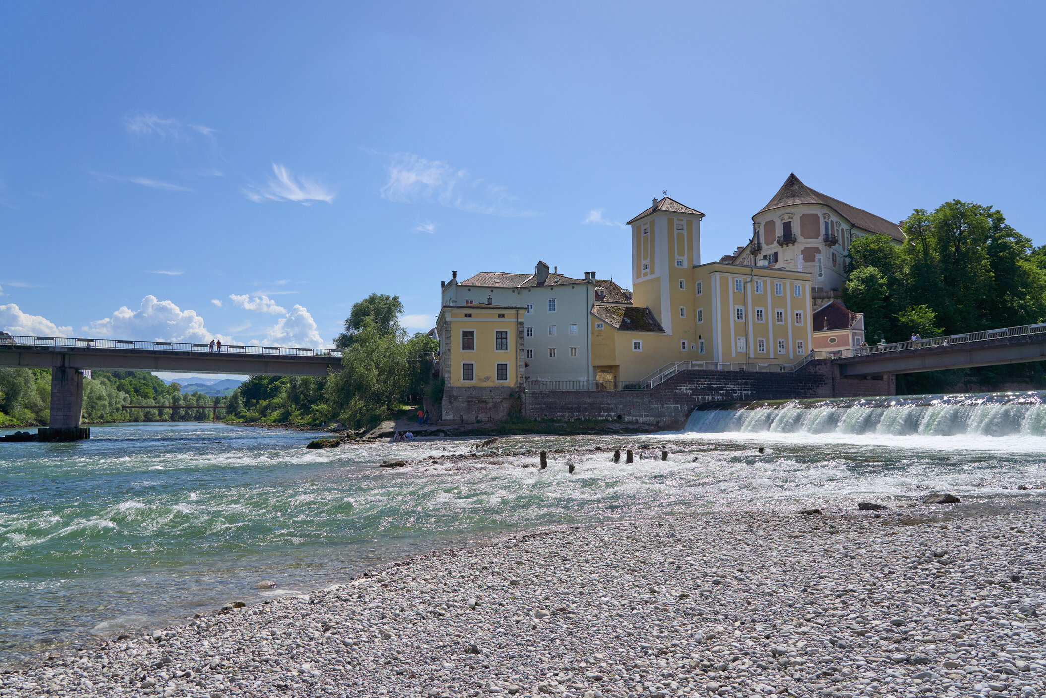 Überquere die Brücke zum Schloss Lamberg. Der barocke Bau mit seinem Park lädt zum Verweilen ein – und bietet einen tollen Blick über die Stadt.