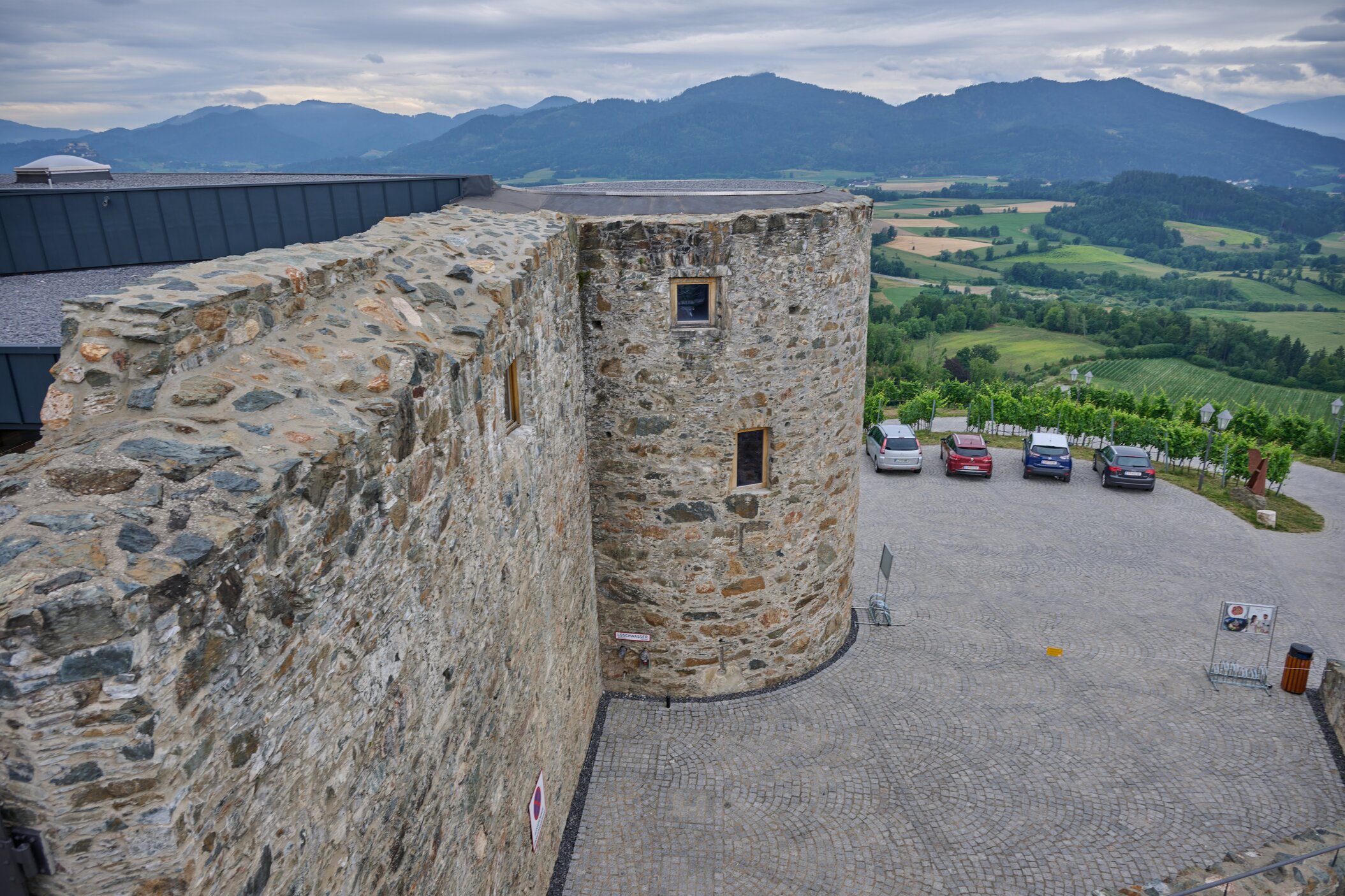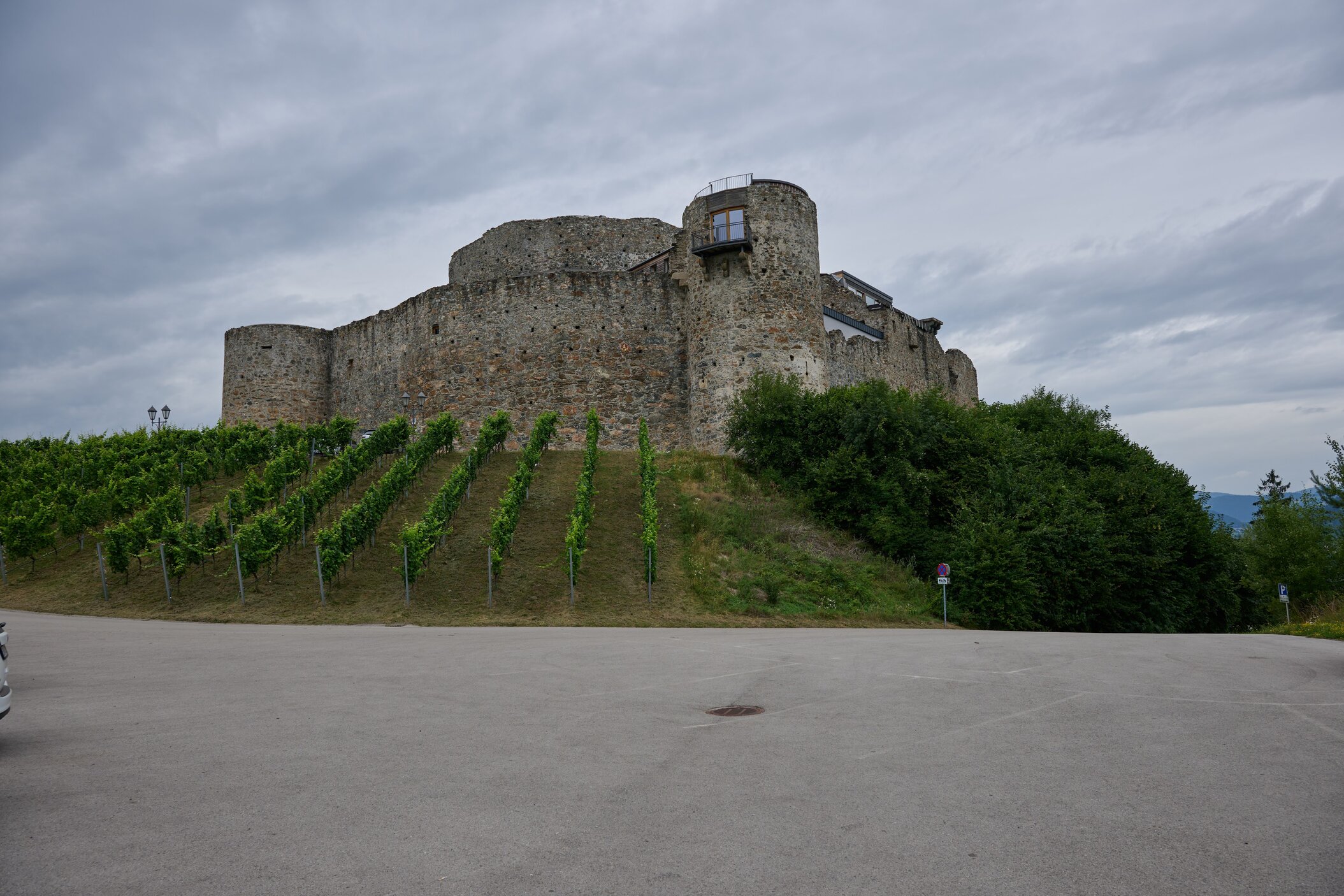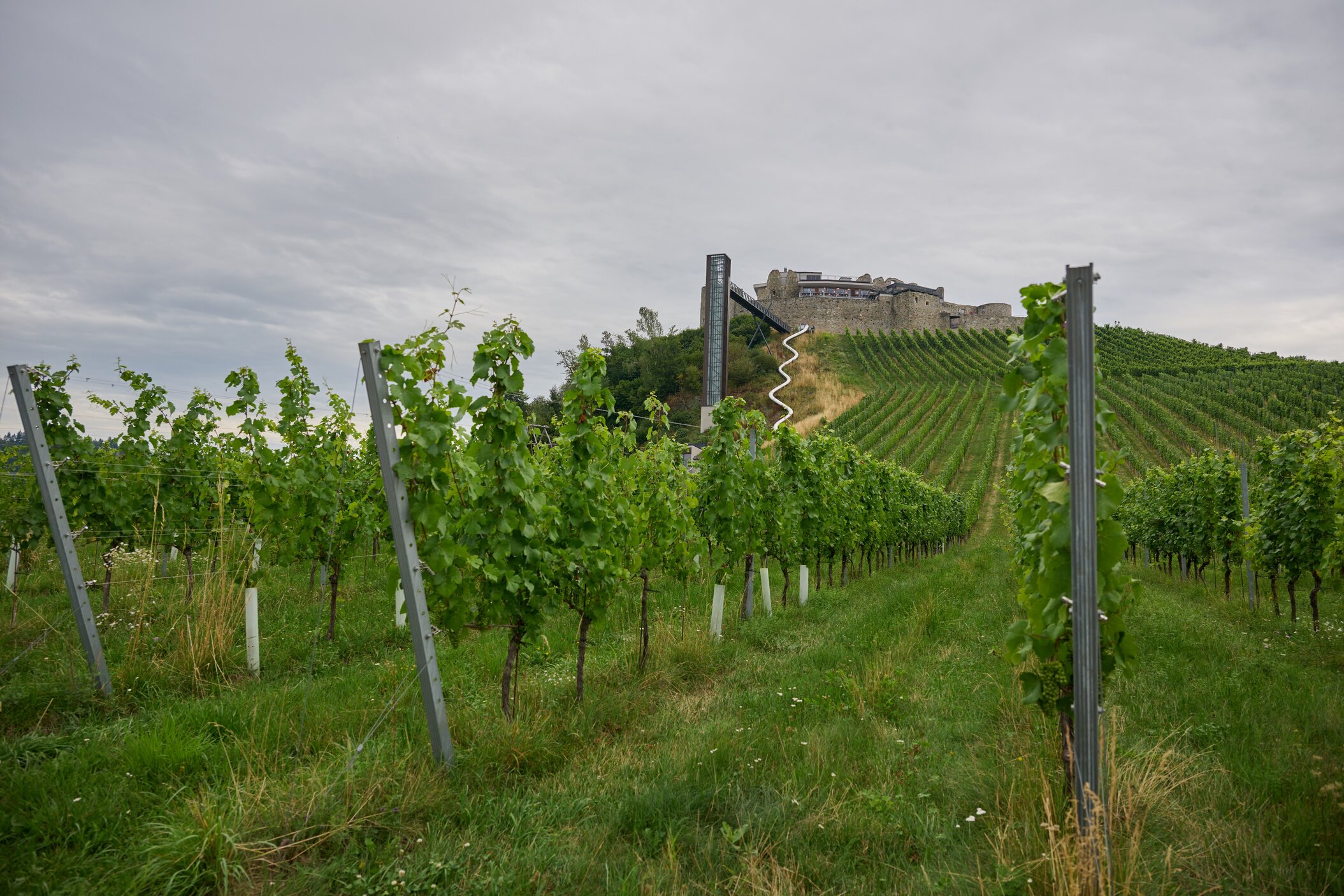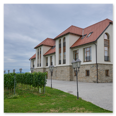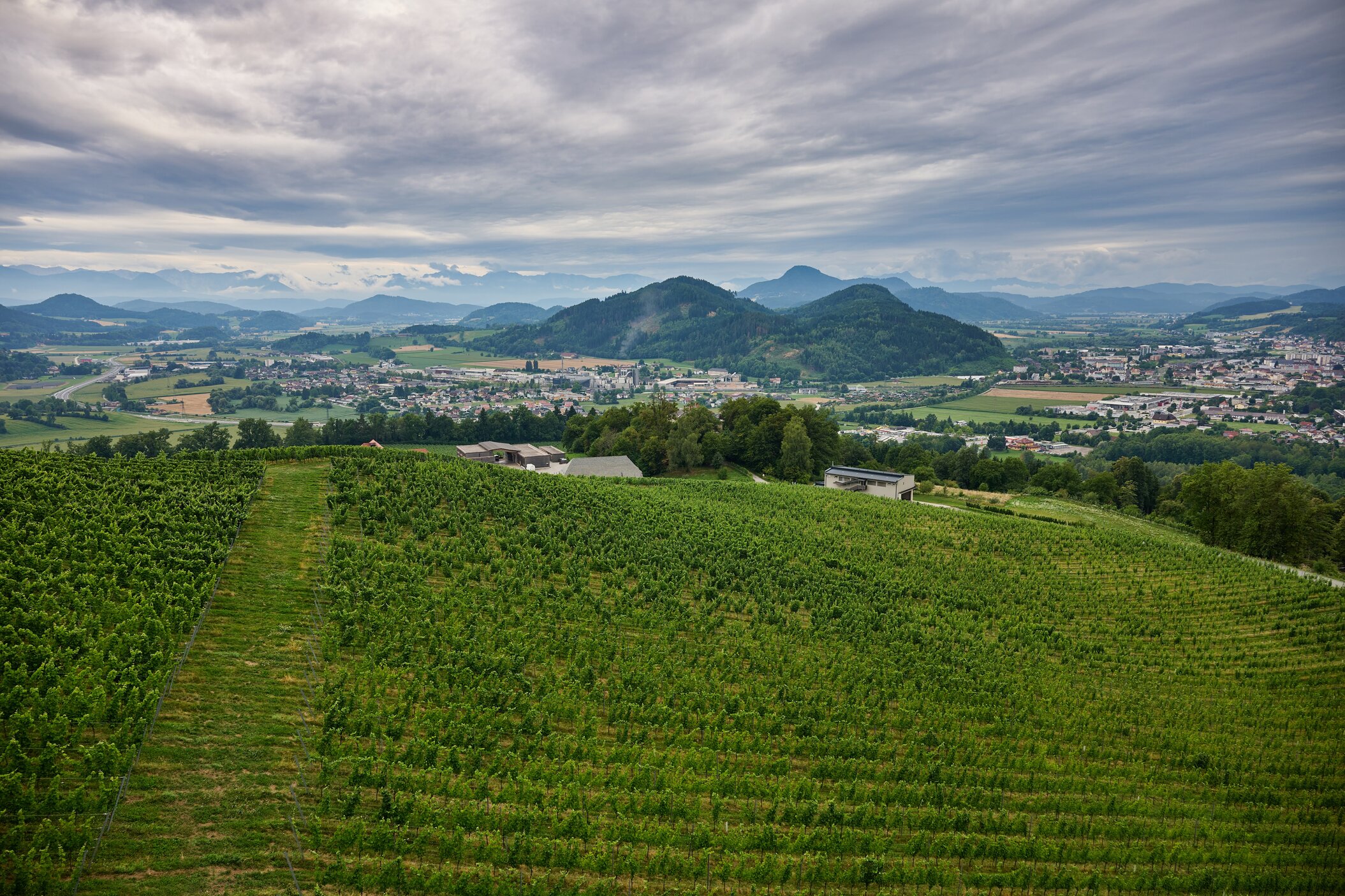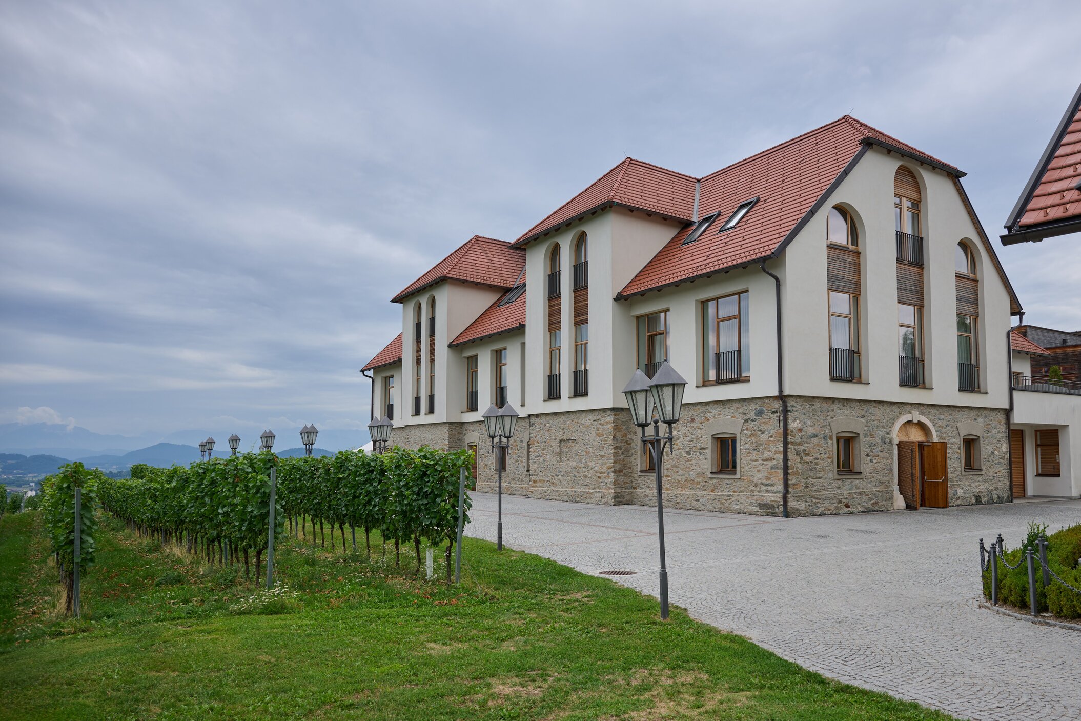 Regionale Weine aus Kärnten – darunter Sauvignon Blanc und Zweigelt. Das moderne Weingut fügt sich harmonisch ins historische Ensemble.