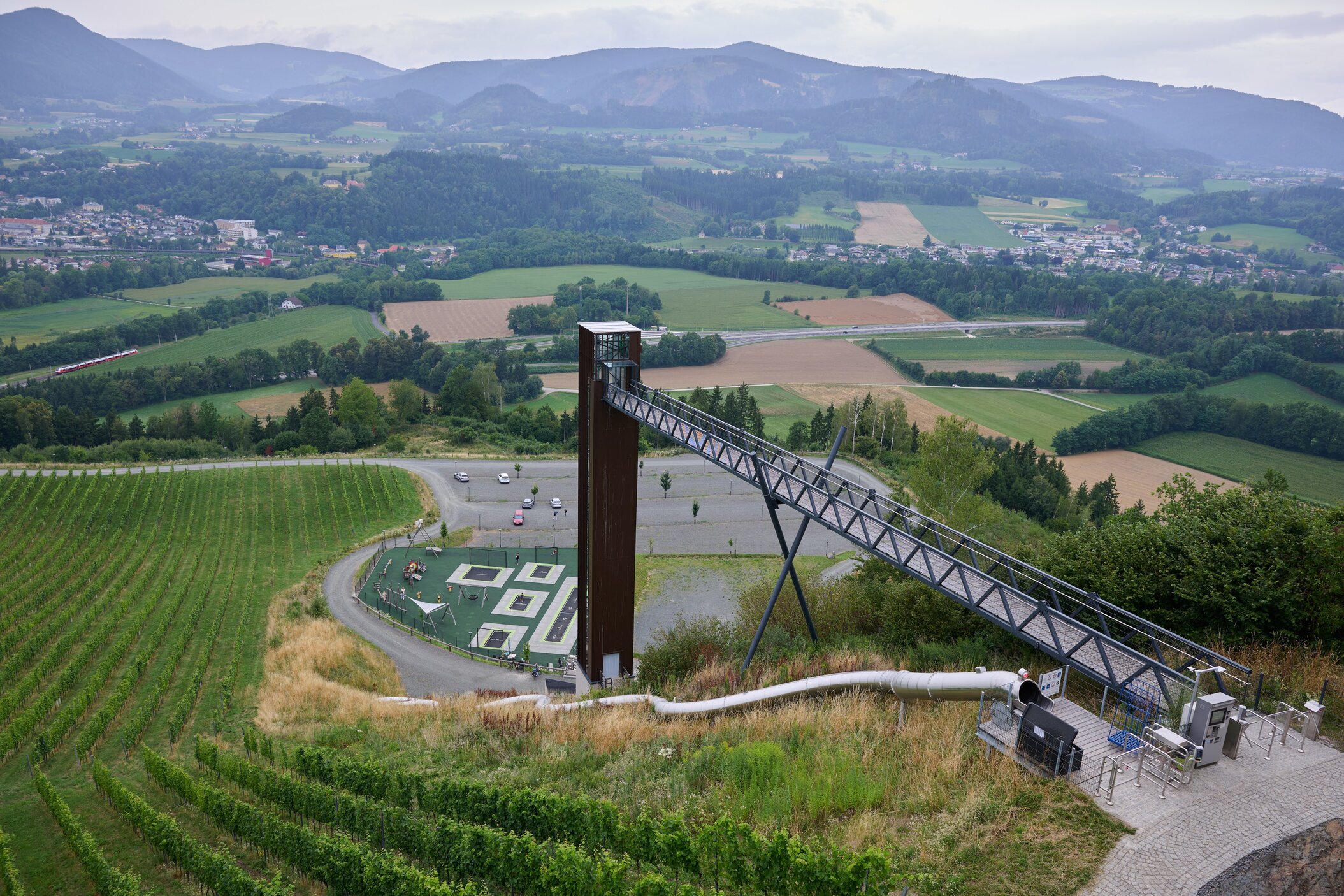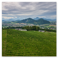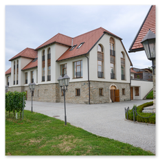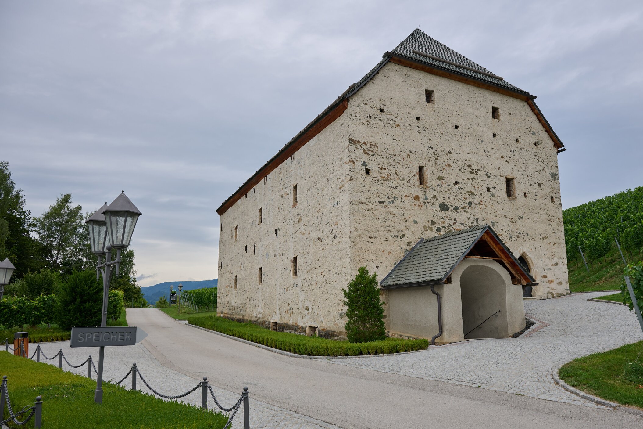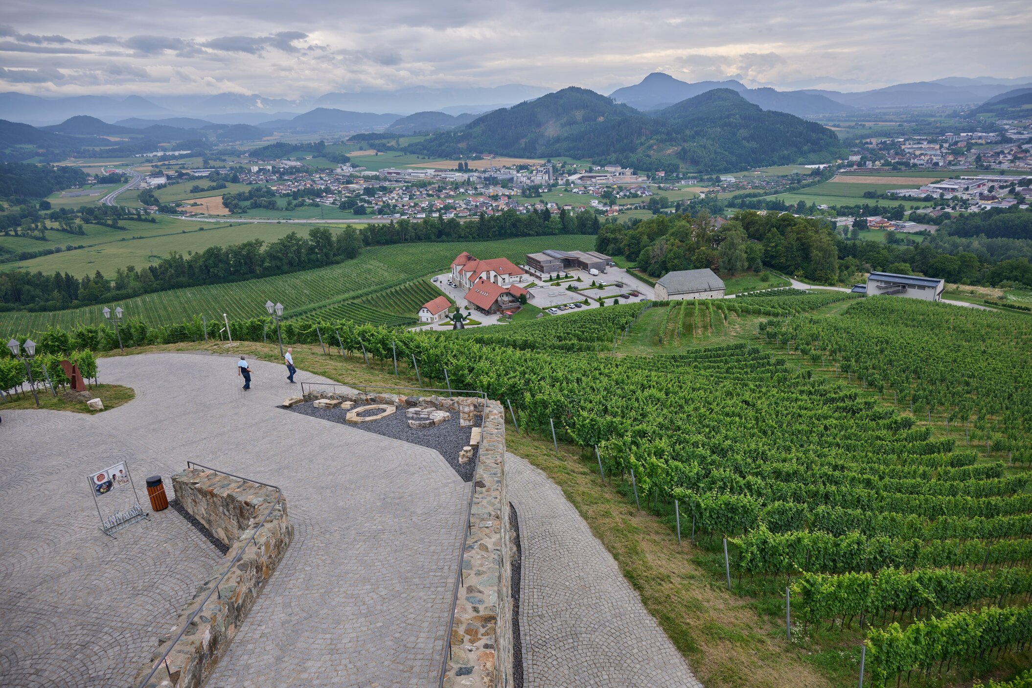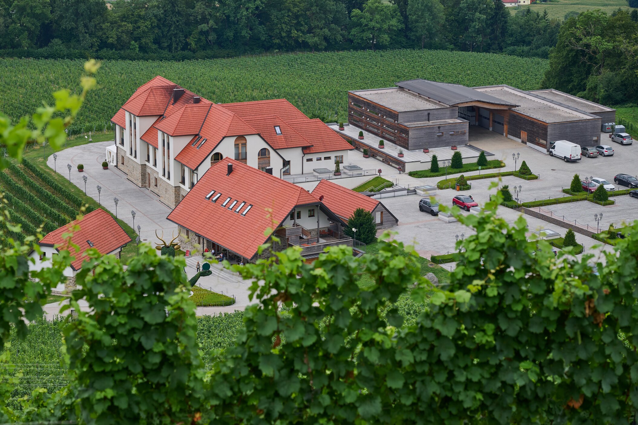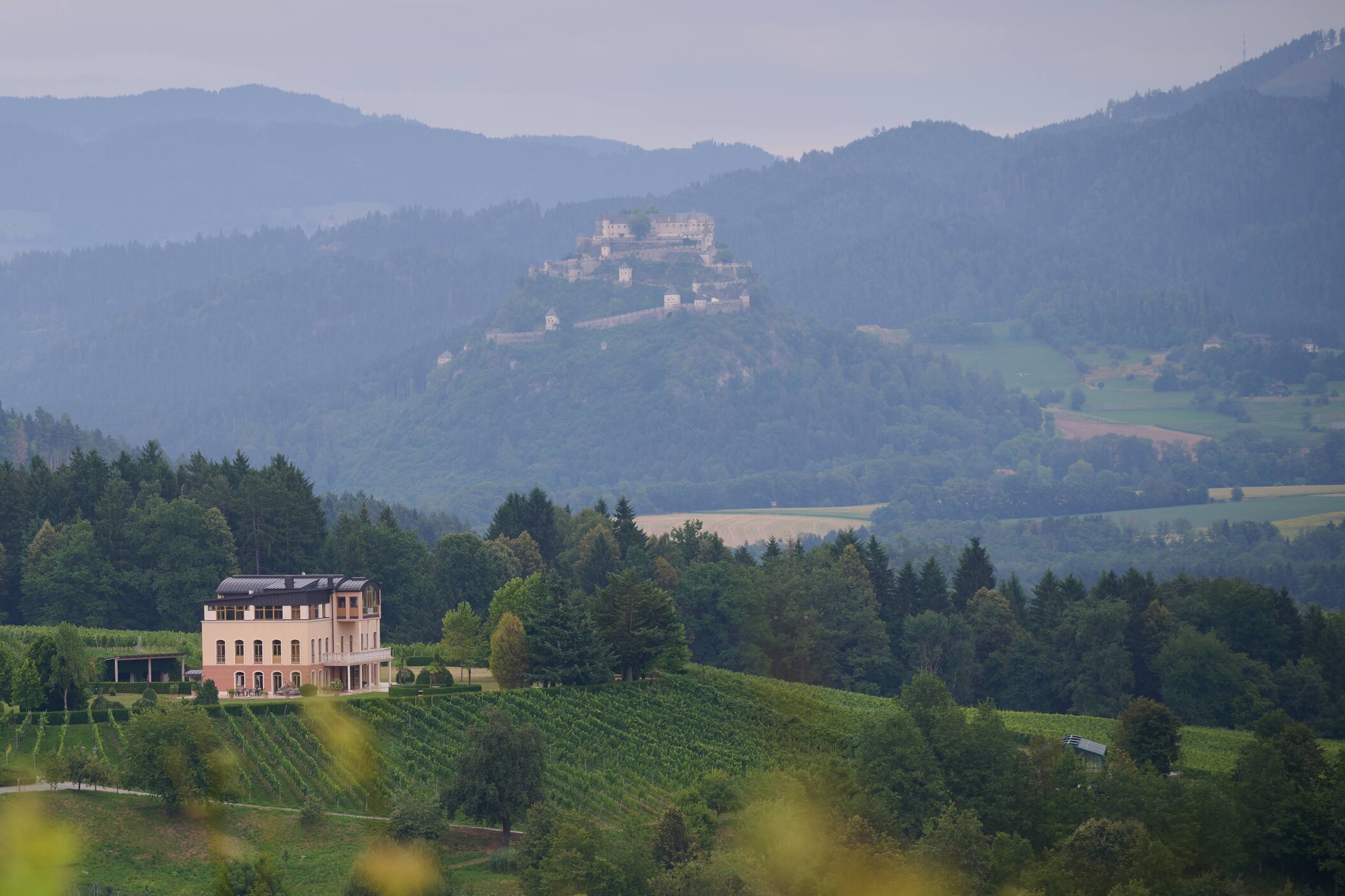 Regionale Weine aus Kärnten – darunter Sauvignon Blanc und Zweigelt. Das moderne Weingut fügt sich harmonisch ins historische Ensemble.