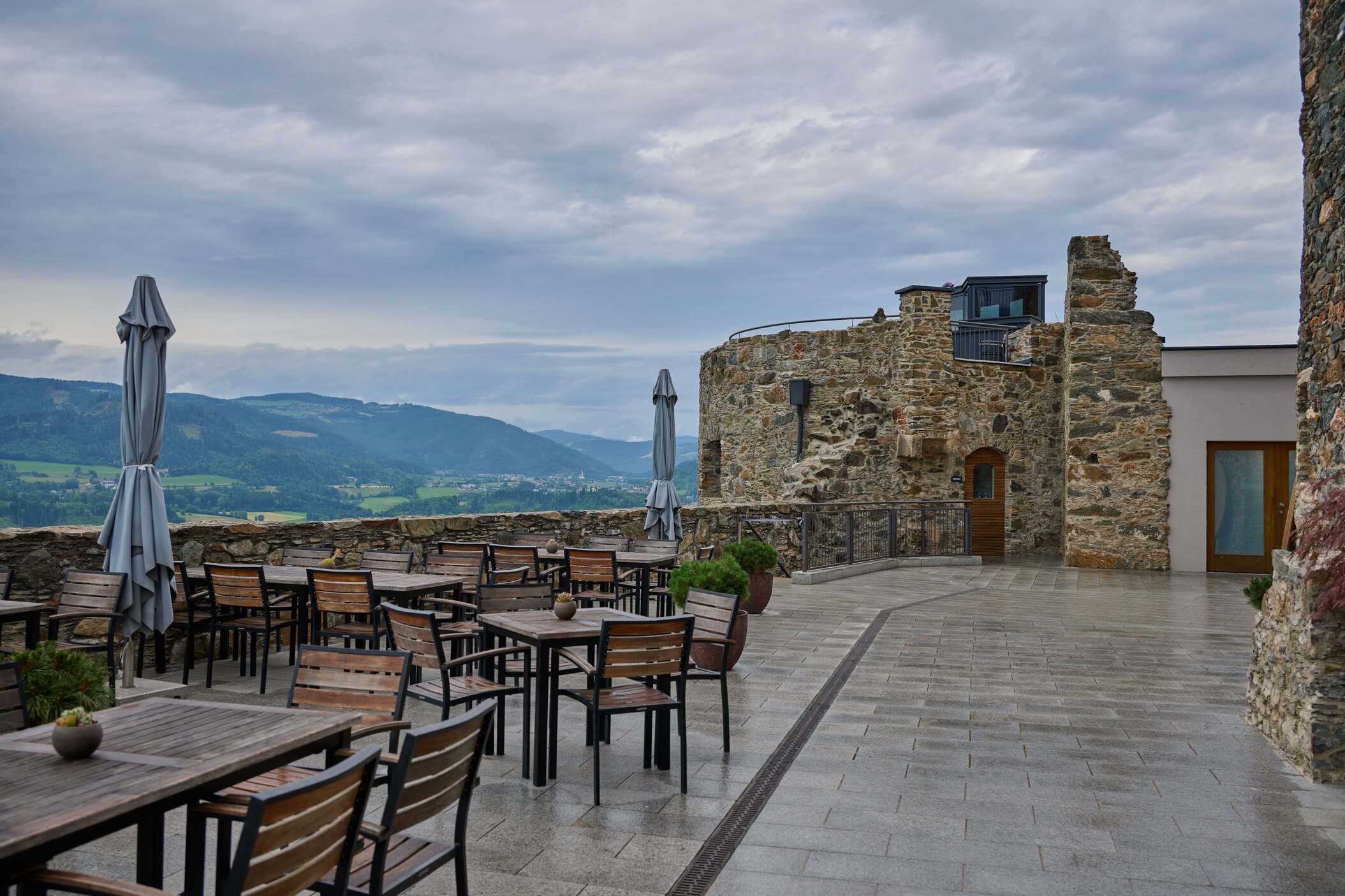 Der Blick reicht über die Dächer Friesachs, Stadtmauer, Dominikanerkirche und Wassergraben – ein Ort zum Innehalten