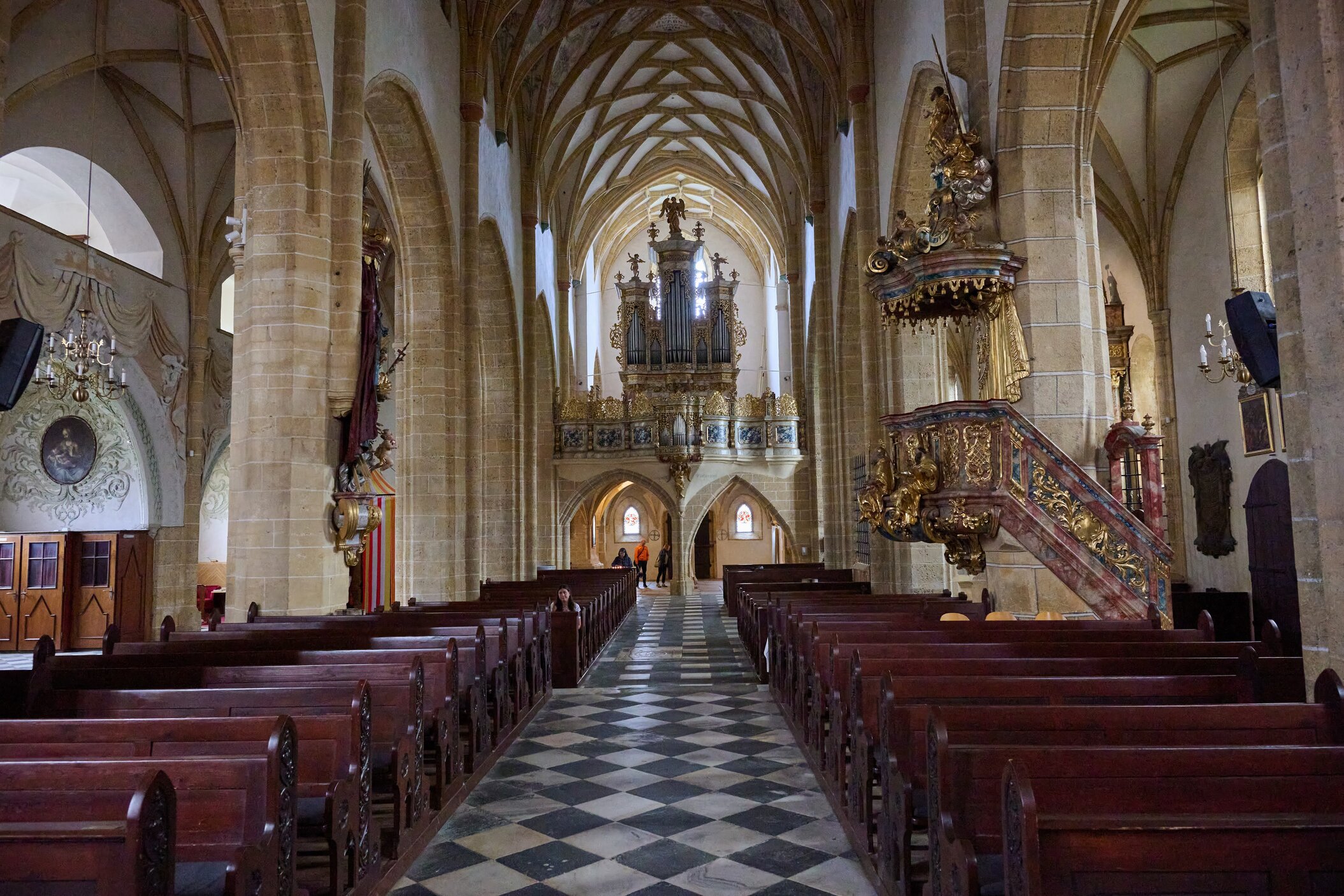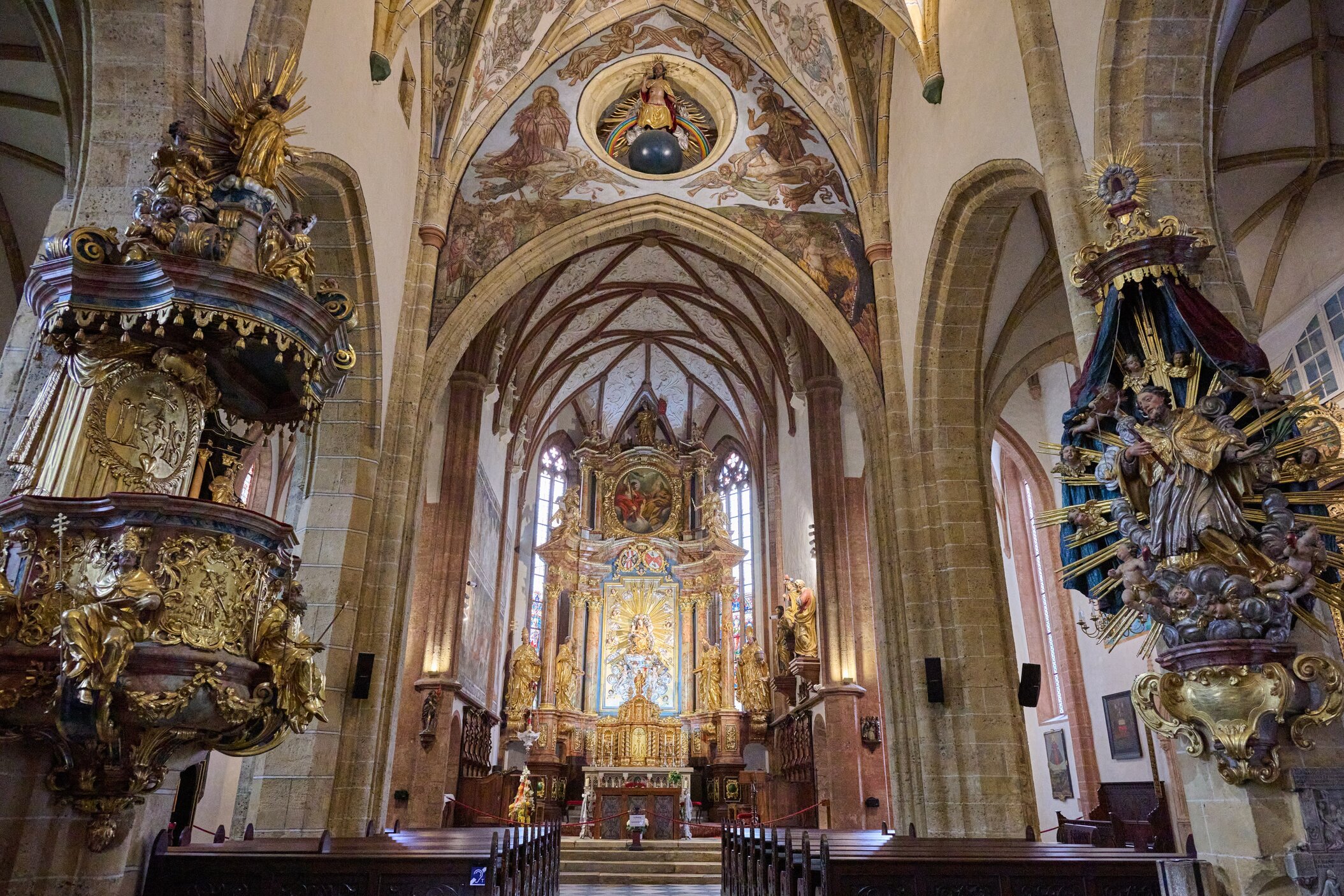 Im Inneren begegnet man gotischen Glasmalereien, barocken Altären, Fresken aus dem 15. Jahrhundert und einem Lapidarium mit römischen Reliefs – darunter Darstellungen von Romulus und Remus.