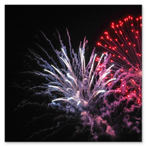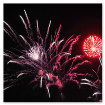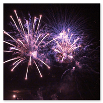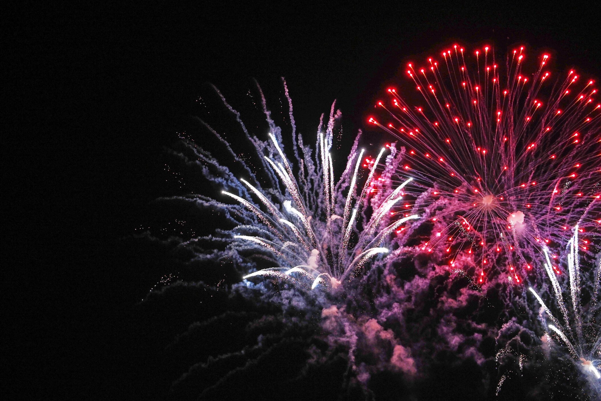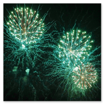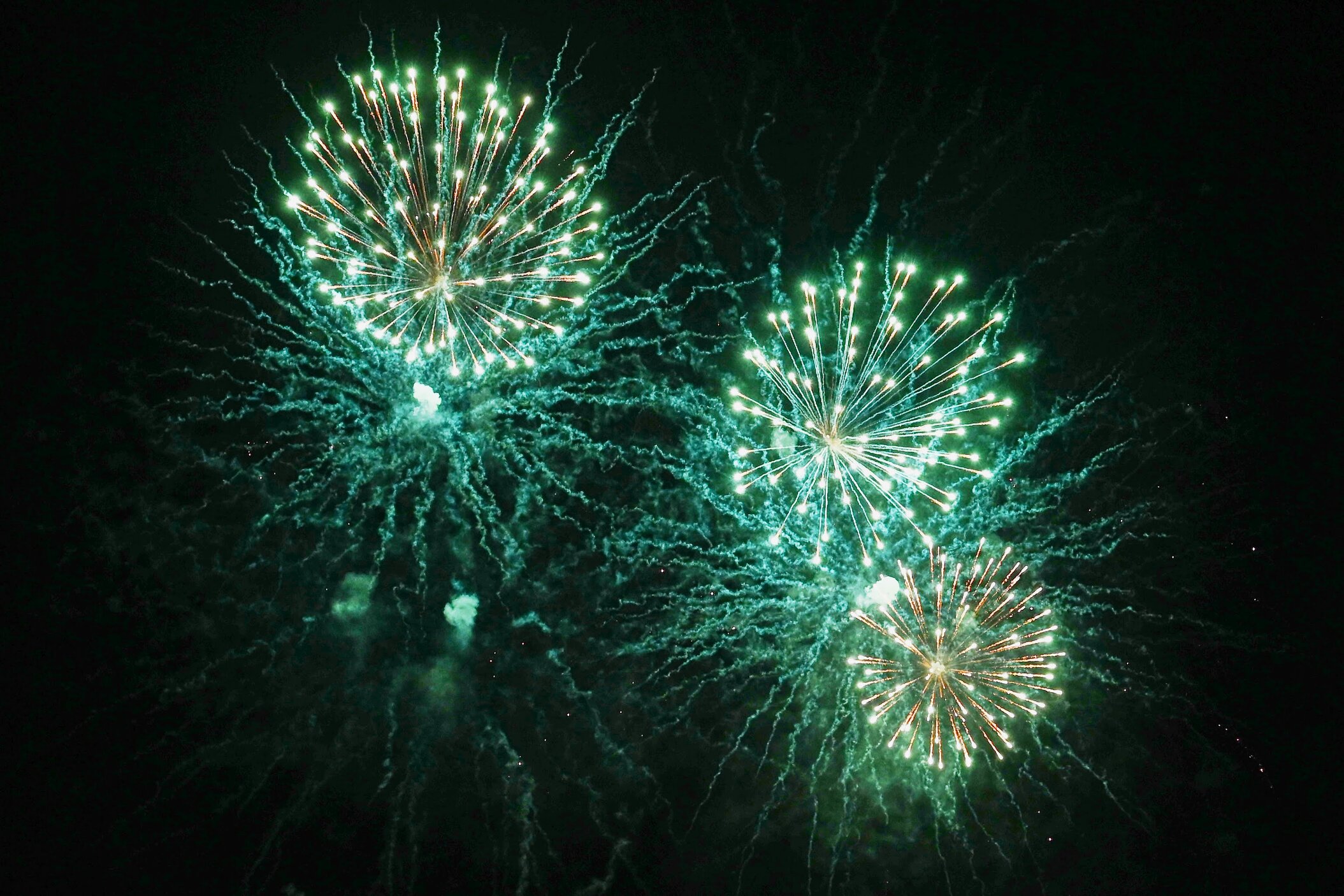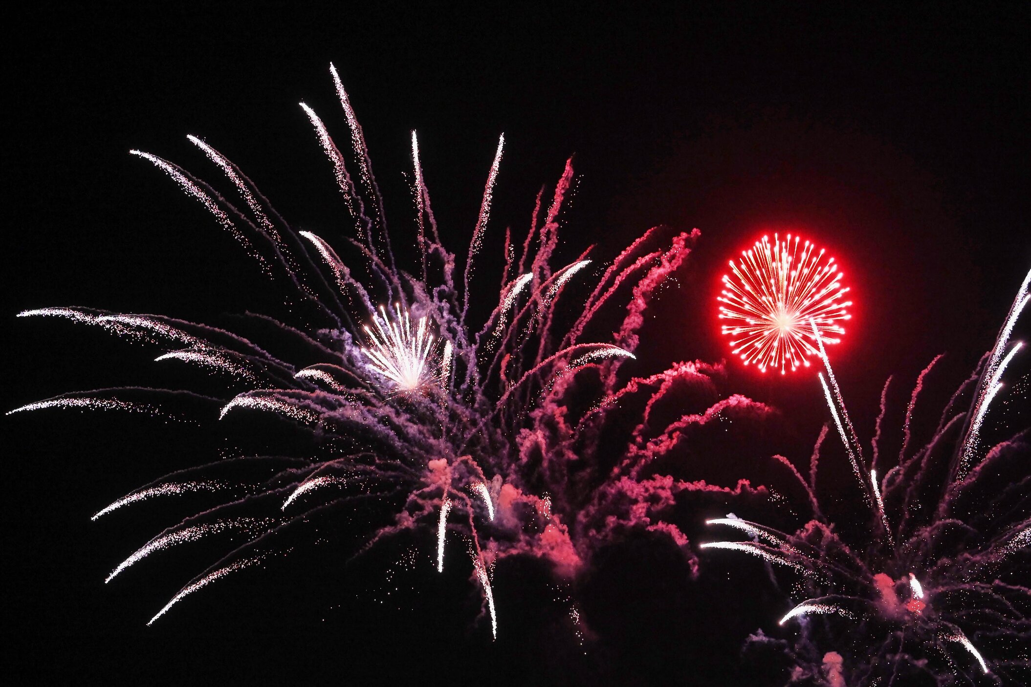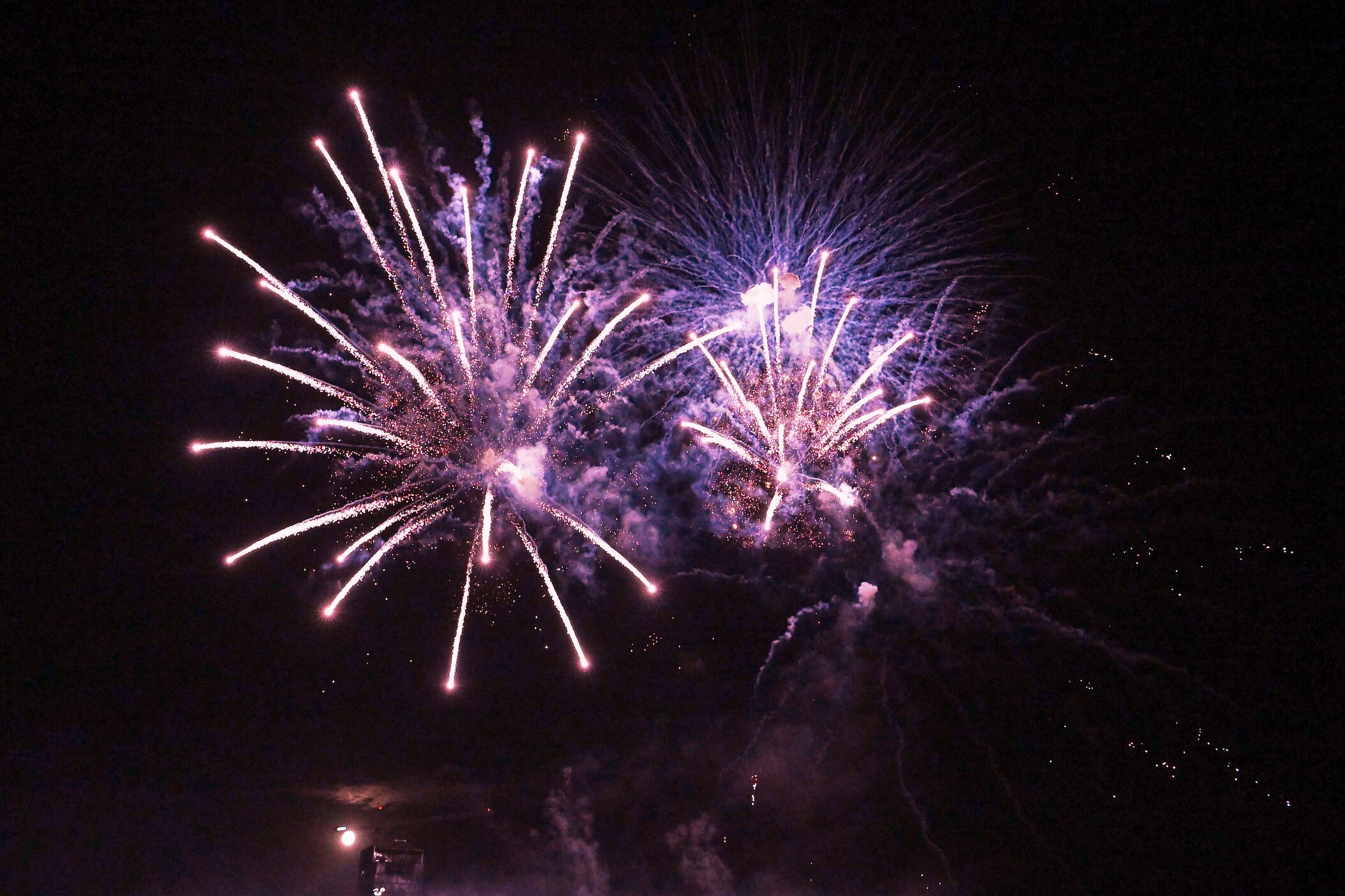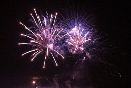 Feuerwerke und bengalische Lichter sind synchron zur Musik inszeniert.