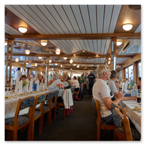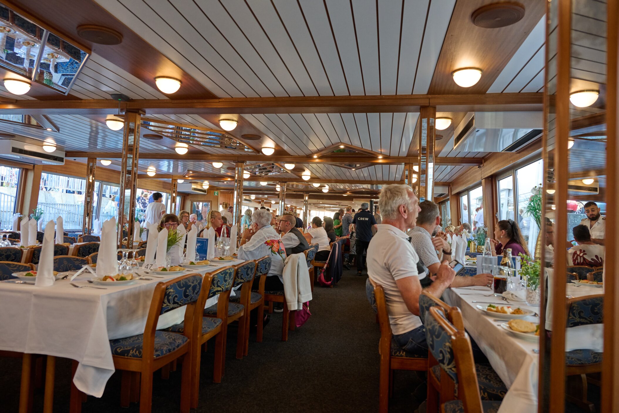 Menü (2- oder 3-Gänge je nach Schiff), musikalische Unterhaltung, Feuerwerk.