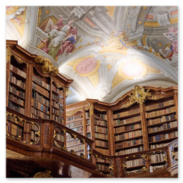 Die Bibliothek im Stift St. Florian ist ein langer Raum mit hohen Regalen und einer feinen Holzdecke. Die Fenster sind mit lichtdämpfenden Platten versehen, wodurch der Raum gedämpft und ruhig wirkt. Die Bücher stehen dicht an dicht – viele sind alt und handgeschrieben. Zwischen den Regalen gibt es kleine Arbeitsplätze, die Stille ausstrahlen. Der Raum ist nicht prunkvoll, sondern klar gegliedert. Die gedämpfte Beleuchtung betont die Ordnung und lässt den Blick ruhig wandern. Die Bibliothek zeigt, wie Wissen gesammelt und bewahrt wird – ohne Ablenkung, ohne Überladung.