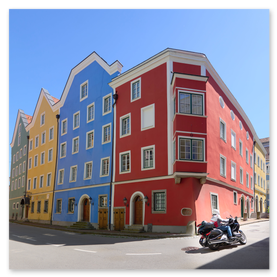 Es gibt Motive, die einen über Jahre hinweg begleiten. Dieses Ensemble aus vier farbenfrohen Häusern ist eines davon. Schon vor langer Zeit einmal beiläufig festgehalten, kehrte es nun in neuer Form zurück: als Panorama, mit ruhigem Blick komponiert, voller Leben und in frischen Farben.