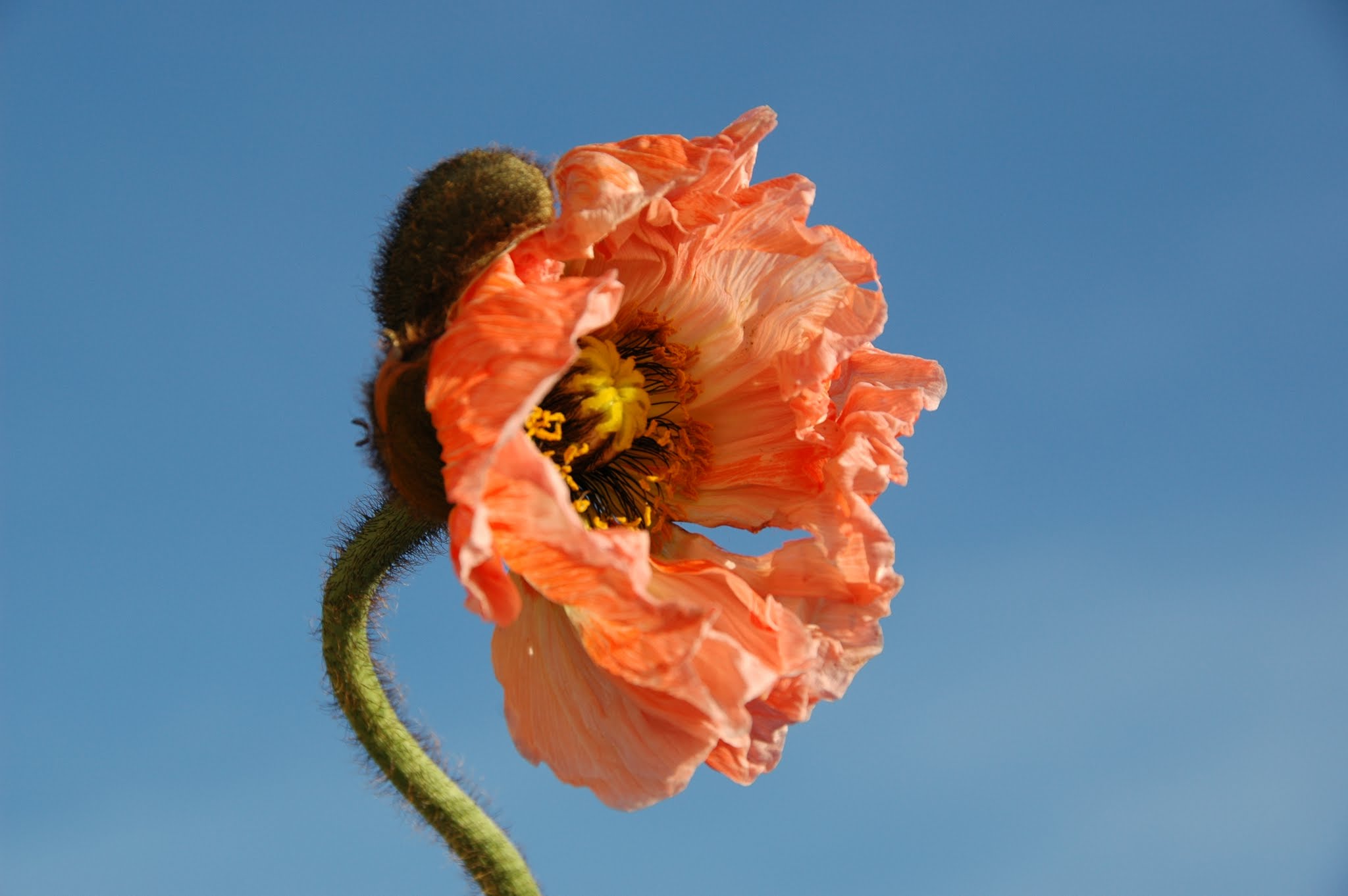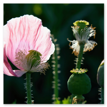 So sieht die fertige Entwicklung des Mohns im Reifestadium aus:Während im obigen Bild noch ein relativ entwickeltes Stadium des Mohns zu sehen ist, bei dem noch Reste der Blüte und die noch grünen Samenkapseln zu sehen sind, ist in diesem Bild die Reife des Mohns erreicht und kurz davor geerntet zu werden.Mohn im Reifestadium wird zwar weit wenige fotografisch festgehalten als die Blütezeit des Mohns, die optisch berauschend sein kann, hat aber auch ob ihrer eigenen Formensprache und - wie hier mit gefülltem Narbenkranz - einen eigenen und sehr aparten Reiz.Die Fülle der Brauntöne, bei morgendlichem Licht ins fast orange gehenden Porenkapseln bilden eine Kulisse, die es Wert ist fotografiert zu werden.